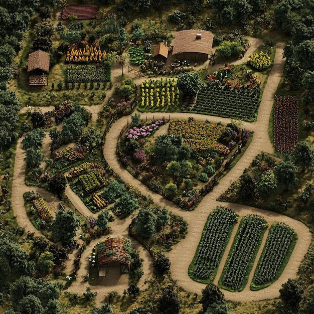 An artistic rendering of another Edenian megalithic KINdom homestead featuring raised garden beds